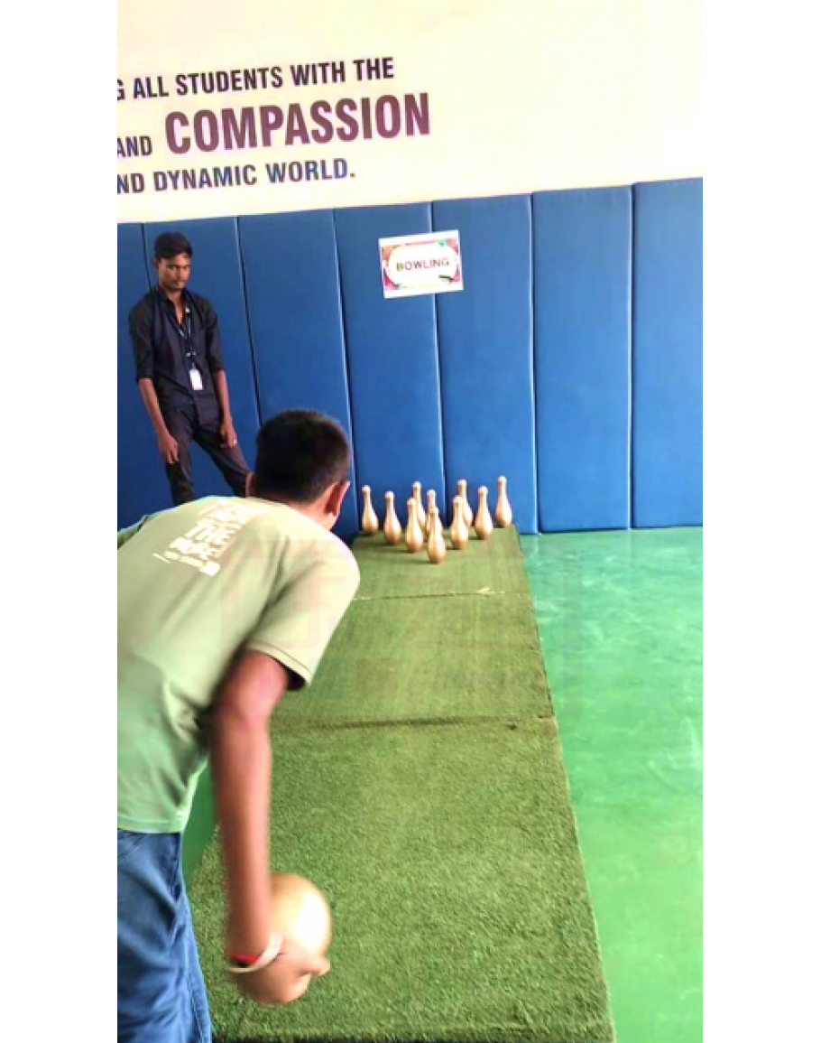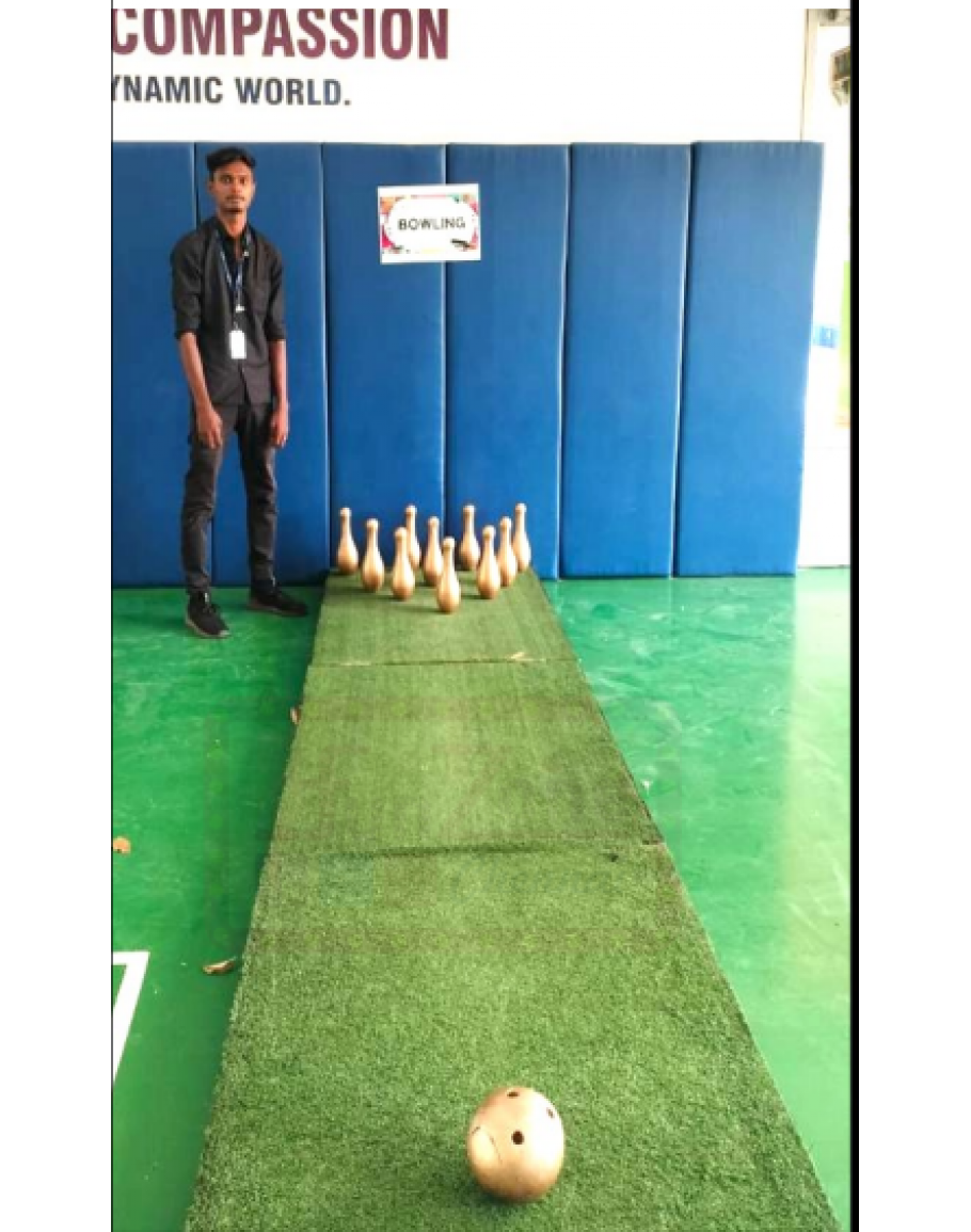 A mini version of snow bowling is created and the participants are asked to knock all the pins down with the given ball. Every participant will get 2 chances.