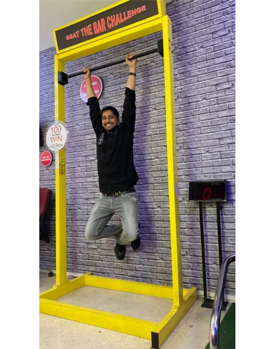 Players need to hang on the bar for a certain time frame to be declared as the winner. It is not as easy as it appears to be.